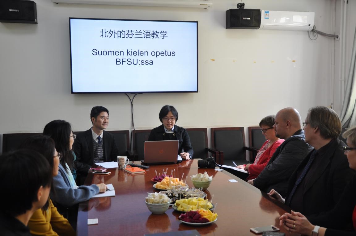 座谈会伊始,欧语学院副院长董希骁对芬兰高中校长团的到访表示热烈的欢迎。随后,芬兰语教师杨新异对北外的芬兰语教学进行了简要介绍,给来访人员留下了非常深刻的印象。