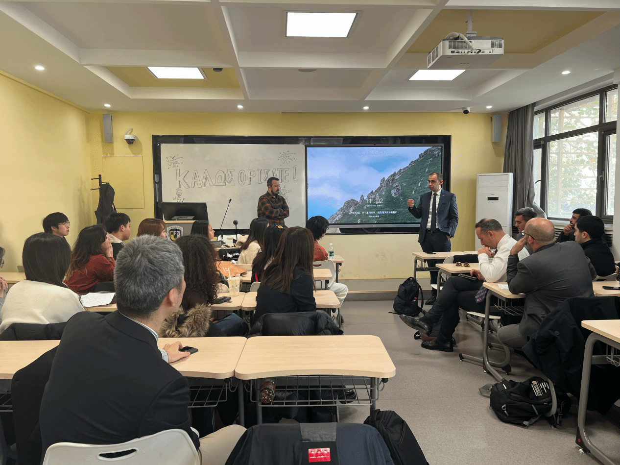 考察团成员与希腊语专业学生进行了热烈互动,现场气氛轻松愉快。在互动问答中,考察团成员耐心回答了同学们关于塞浦路斯大学生活、青年关注的社会议题以及塞浦路斯话题。