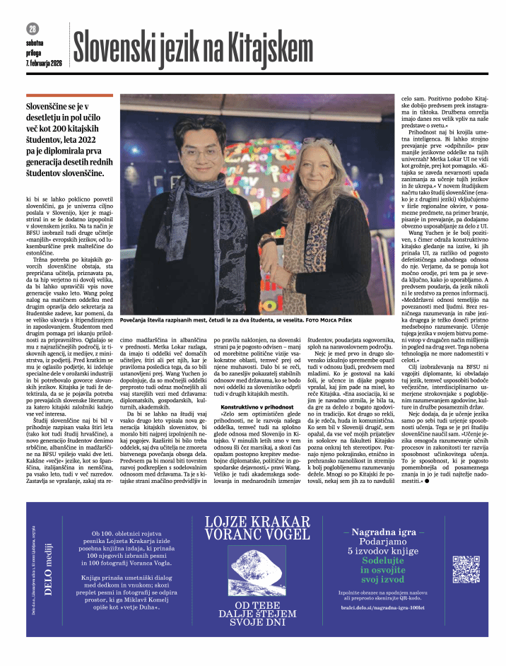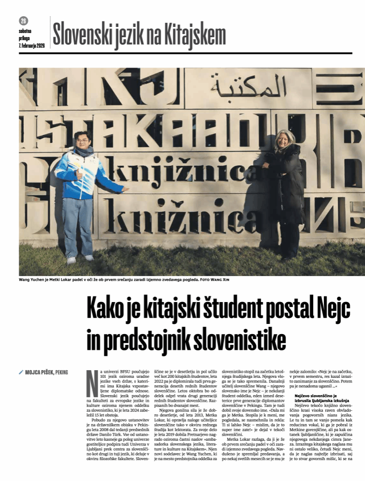 近日,北京外国语大学欧洲语言文化学院斯洛文尼亚语教研室教师王雨辰与外籍专家教师梅特卡·洛卡尔(Metka Lokar)共同接受斯洛文尼亚主流日报《劳动报》(Delo)专访。相关报道于当地时间2026年2月7日刊登于《劳动报》周六增刊栏目《Sobotna priloga》。