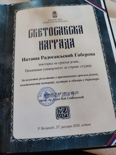 2026年,塞尔维亚教育、科学与技术发展部向北京外国语大学欧洲语言文化学院塞尔维亚籍专家娜塔莎·拉多萨夫列维奇·加贝洛娃(Nataša Radosavljević Gaberova)颁发圣萨瓦奖(Nagrada Svetog Save),以表彰其在推广塞尔维亚语言、文学、历史、文化及中塞合作方面做出的杰出贡献。