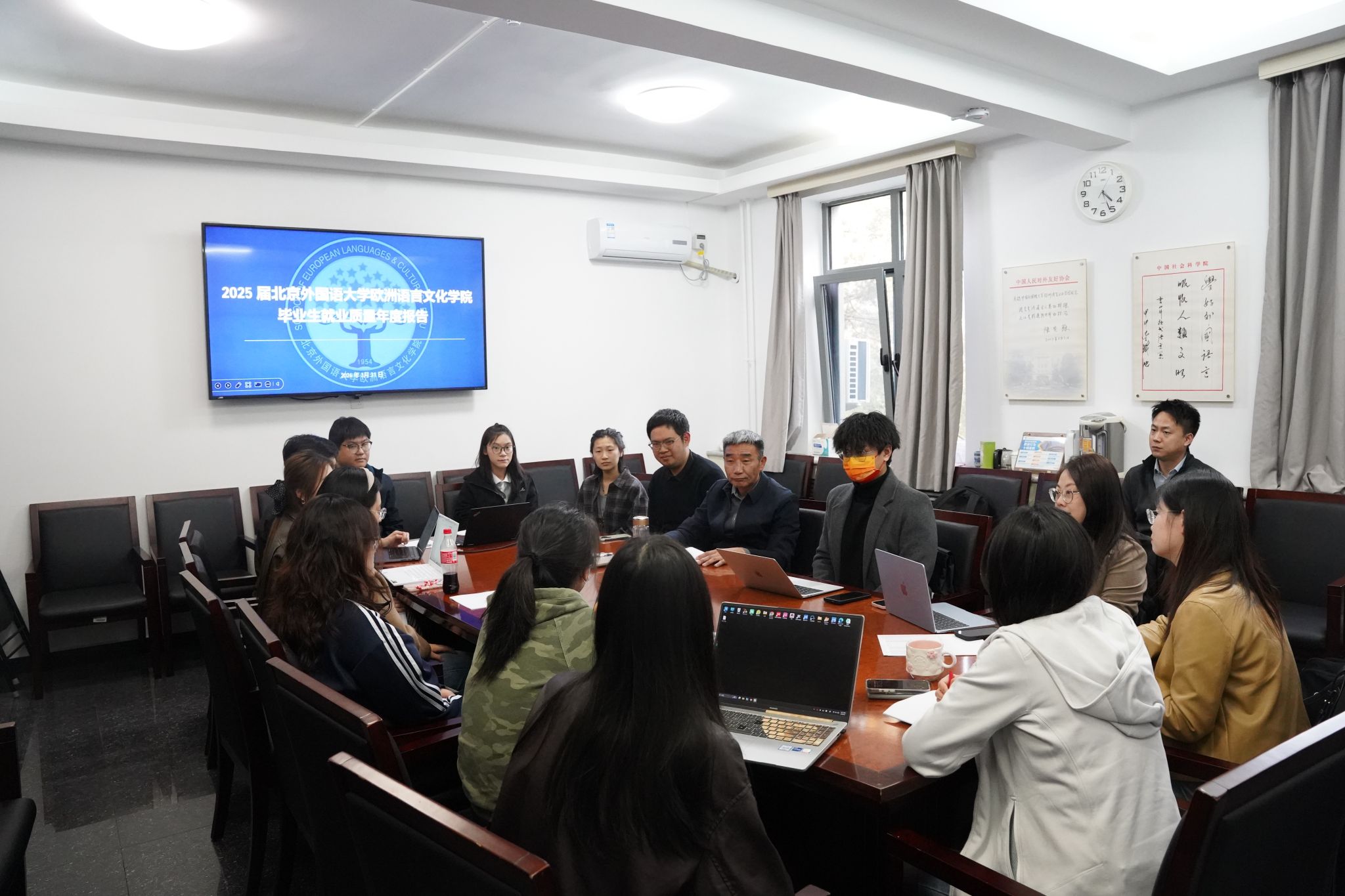 本科生辅导员于偲彤、研究生辅导员王雨辰对近年就业数据及2026届就业工作做了分析汇报,拉丁语、斯洛伐克语、波兰语、意大利语、爱沙尼亚语、阿尔巴尼亚语专业班主任分别介绍了2026届毕业生基本情况。